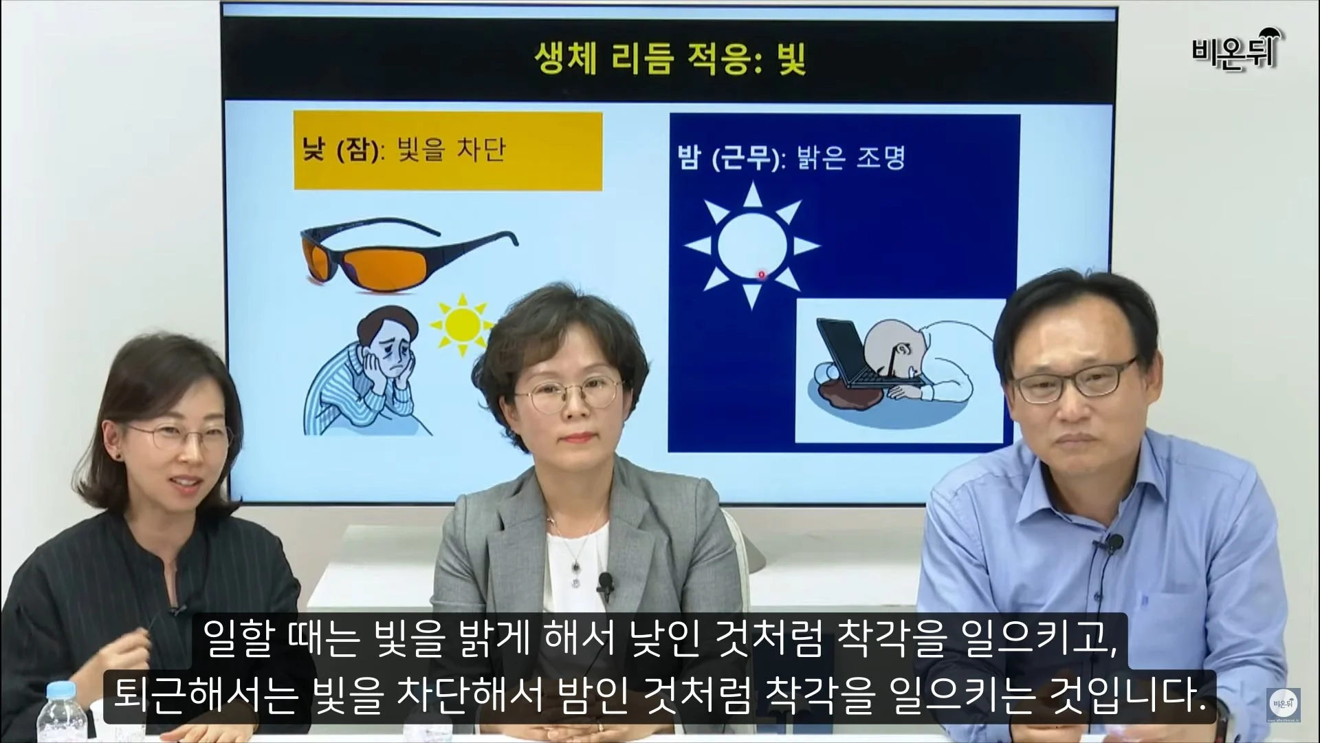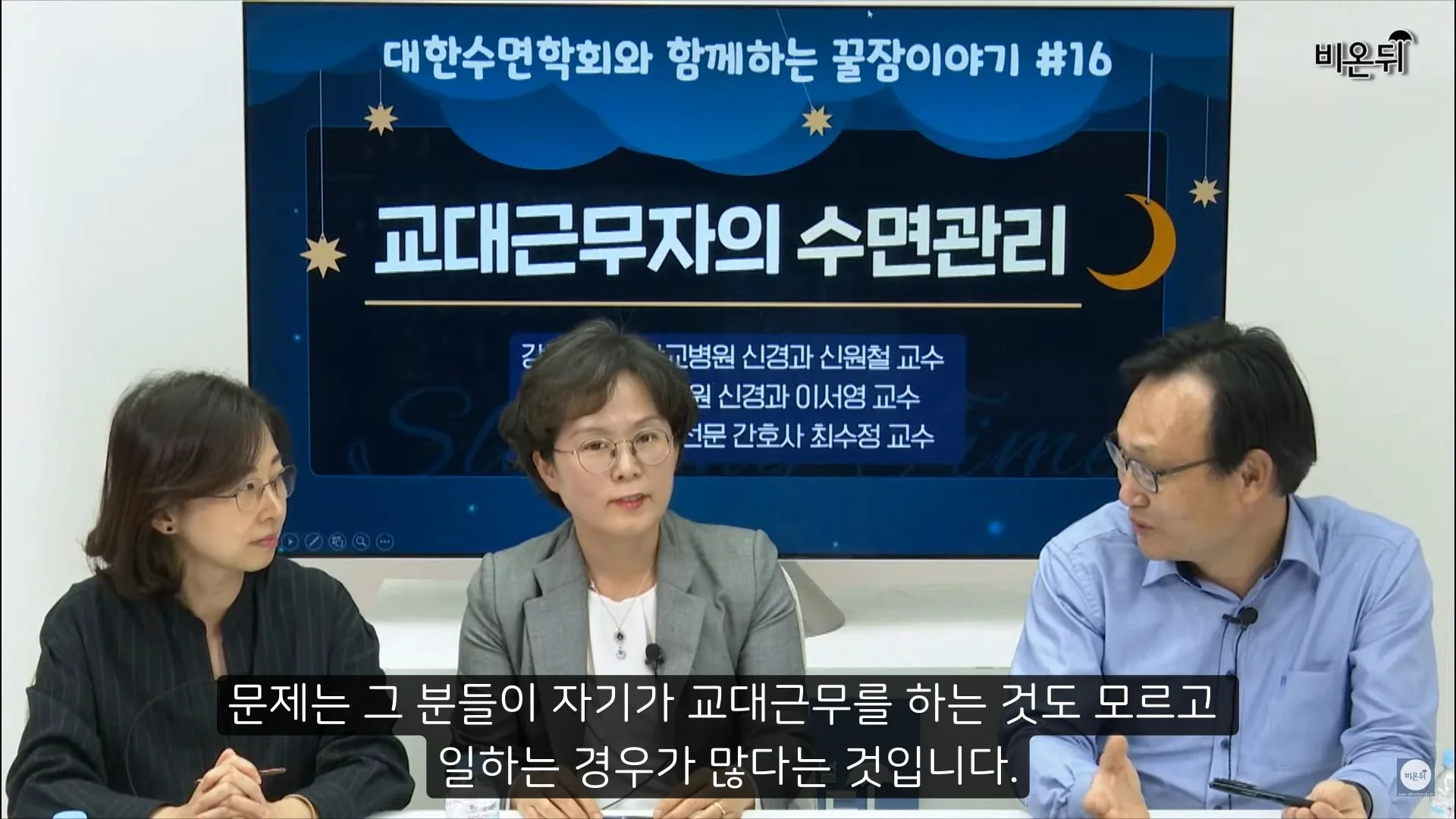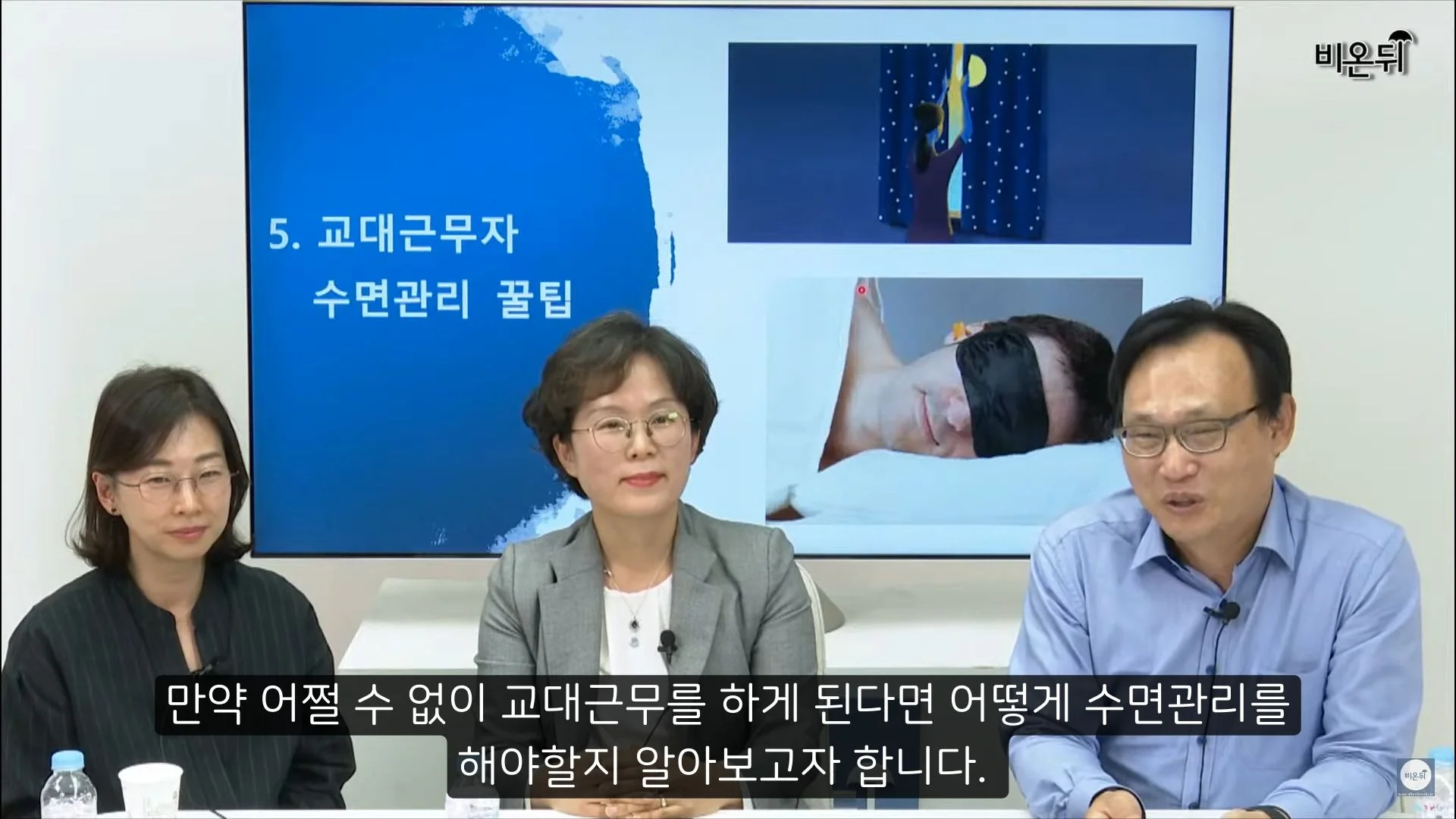 이 교대근무자분들이 수면관리를 해야 한다면 빛을 조절하는 것이 좋습니다. 밤에 일을 할 때는 낮인 것 처럼 빛을 밝게 하고, 낮에 잠을 취할 때는 빛을 차단해서 우리 몸이 밤이라고 인식시키는 것이 좋습니다. 그러나 사실은 야간에 잠을 자기 위해서는 정책적인 노력이 필요합니다. 야간근무자들에게 쉴 곳을 마련해주고 30분 정도는 휴식시간을 제공하는 노력이 필요할 것입니다.