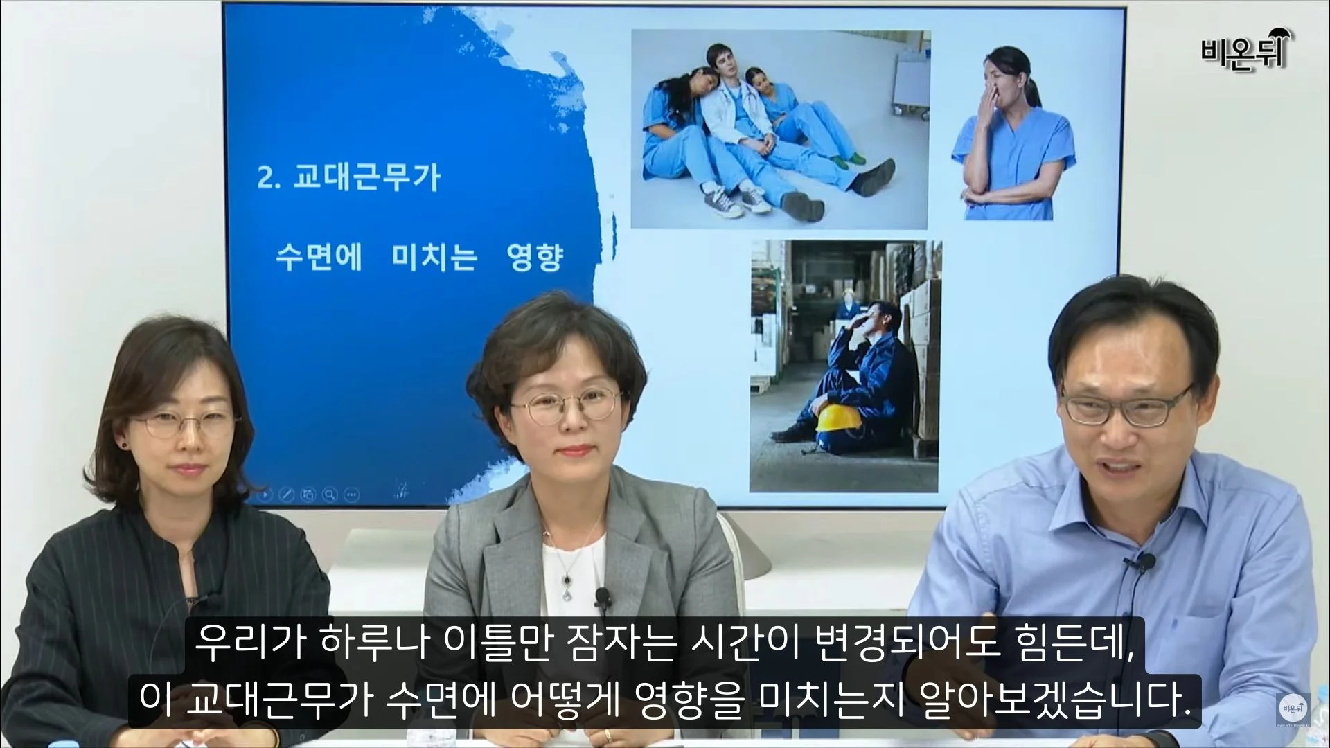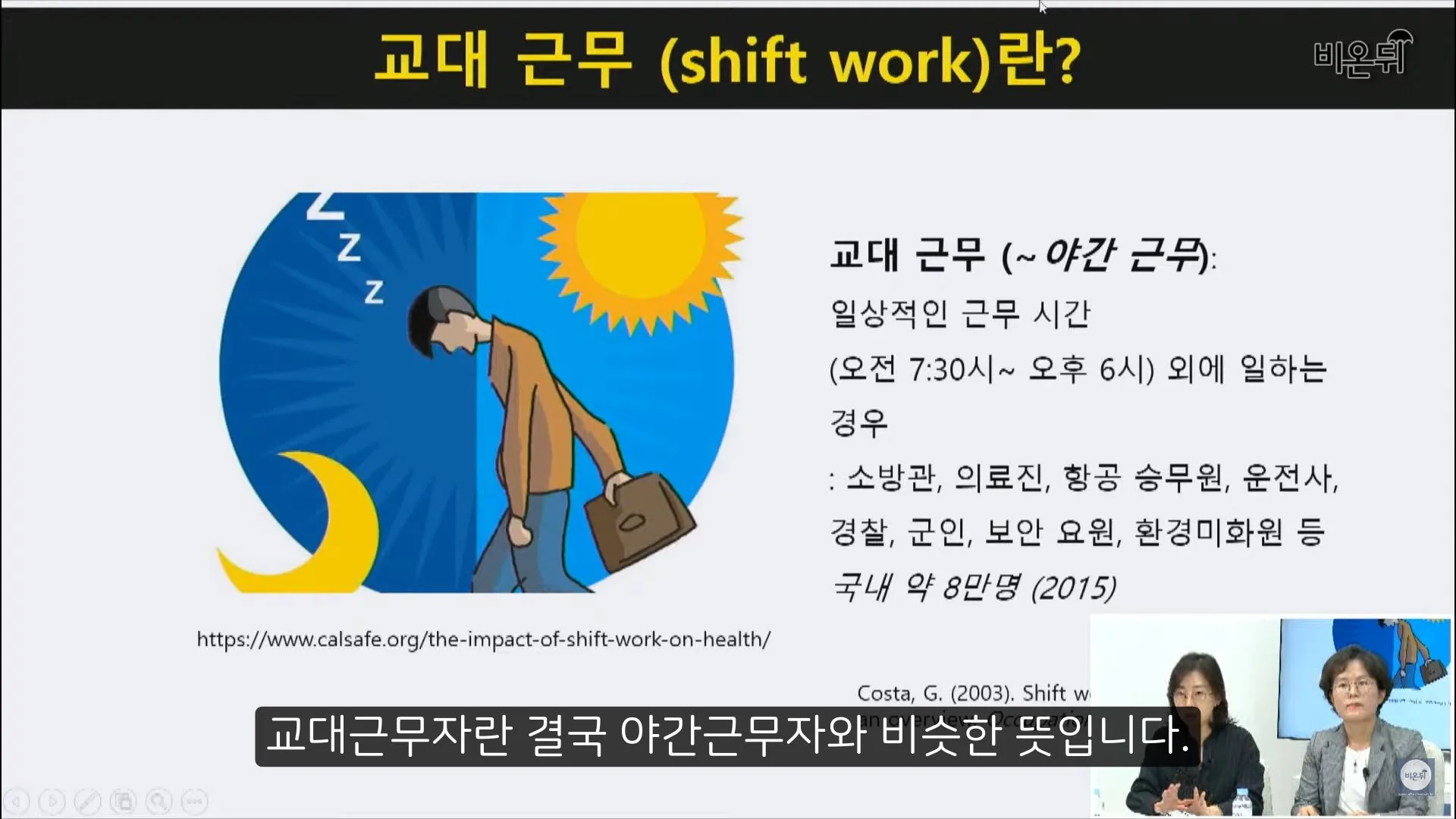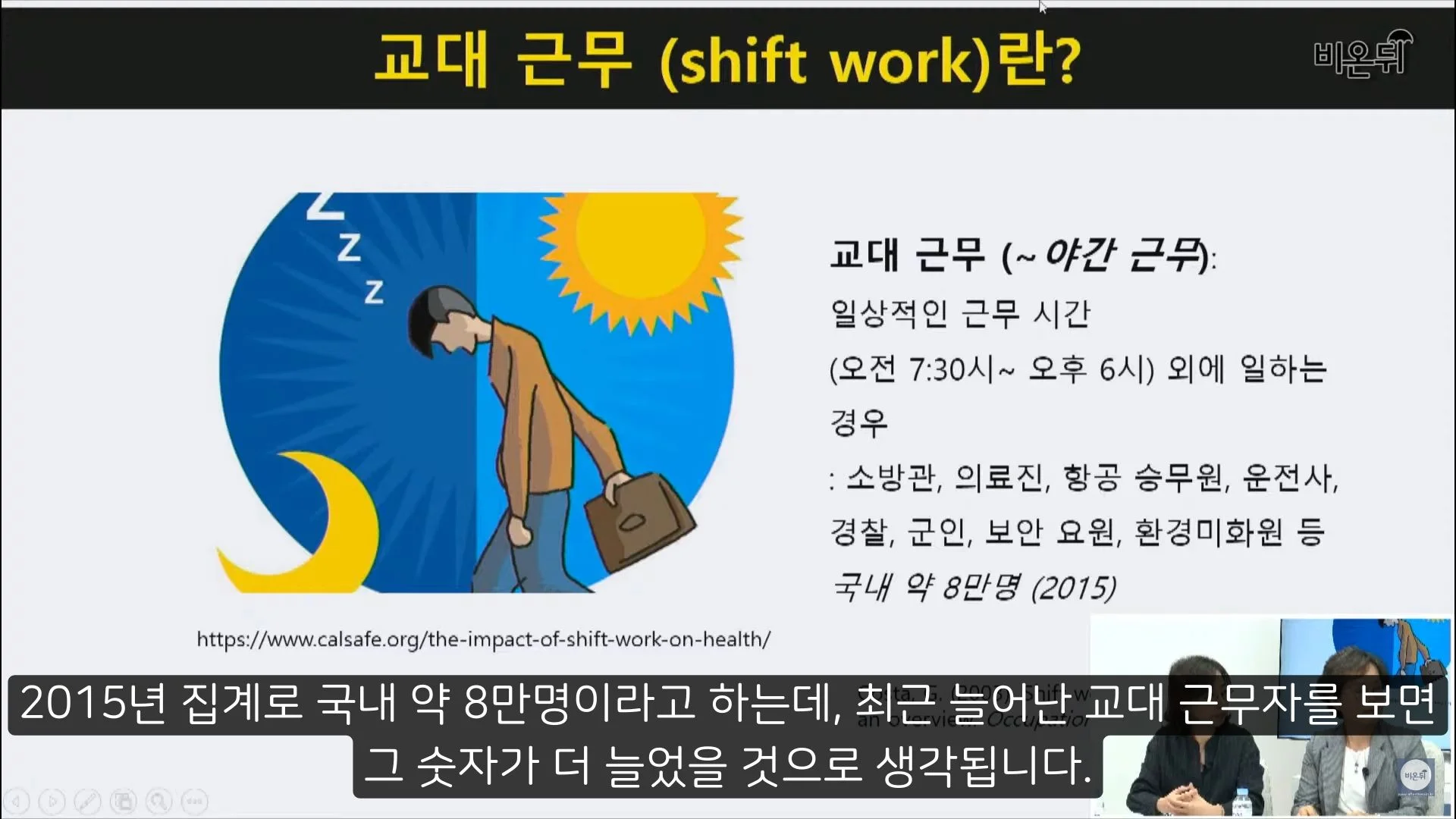 교대근무자란 일상적인 근무시간(오전 7:30~에서 오후 6:00)을 벗어난 시간에 일하는 사람들을 말합니다. 결국 야간 근무자와 비슷한 말인데요, 교대근무는 기본적으로 밤에 일하고 낮에 자야 해서 밤낮이 바뀌게 됩니다. 밤낮이 바뀌면 불면증같은 수면 장애는 물론이고 생체리듬이 교란되기 때문에 여러 질병이 유발될 가능성이 있습니다.
