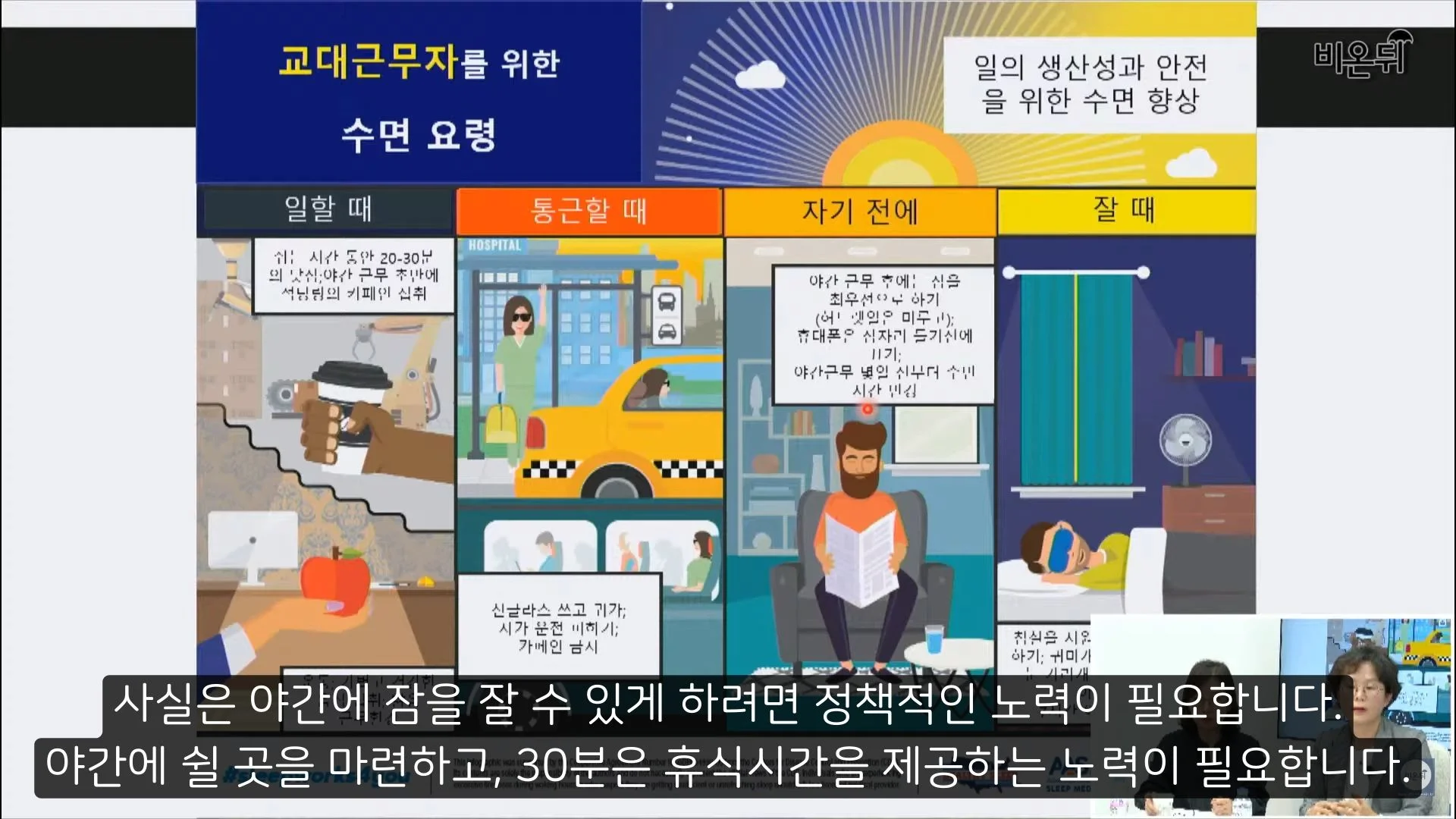 그러나 사실은 야간에 잠을 자기 위해서는 정책적인 노력이 필요합니다. 야간근무자들에게 쉴 곳을 마련해주고 30분 정도는 휴식시간을 제공하는 노력이 필요할 것입니다.